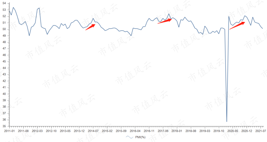 (2011.1~2021.8PMI指数,数据来源:Choice)