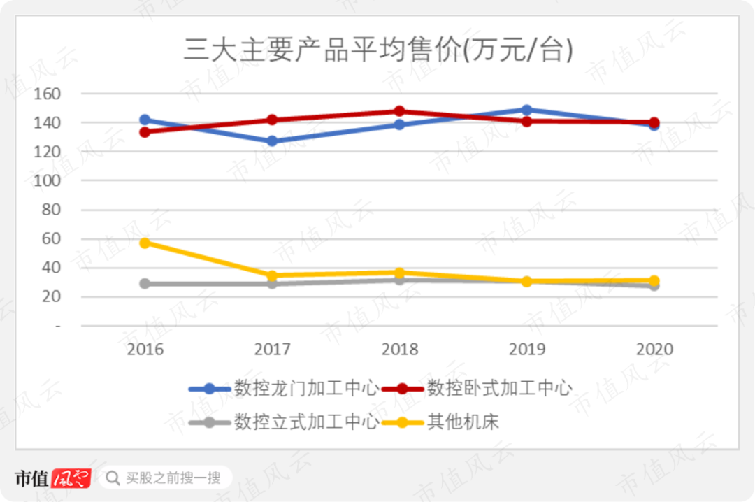 从产品分类来看,海天精工数控龙门加工中心和数控卧式加工中心的平均售价,基本保持在130万元/台以上。