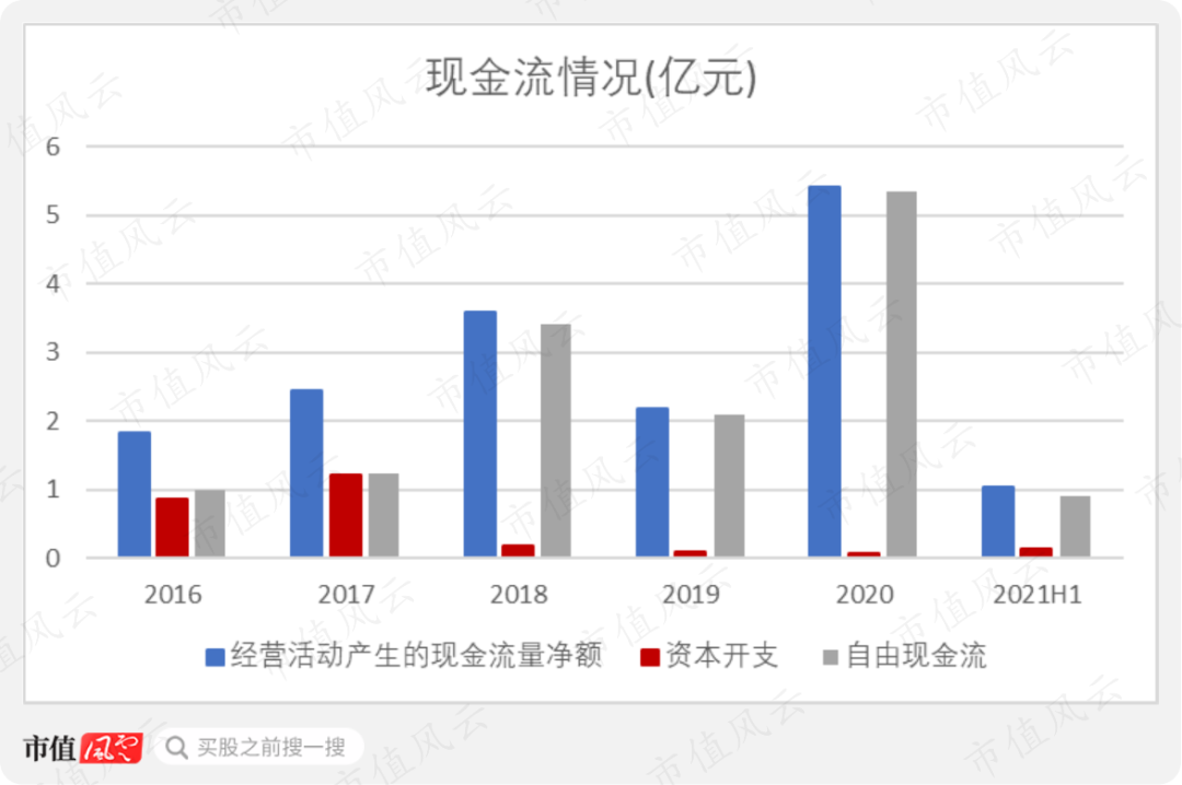 2018年起,海天精工就没有任何有息负债,且在手现金规模逐渐升高。截至2021年6月末,海天精工手握9.63亿元现金,占到总资产的28%。
