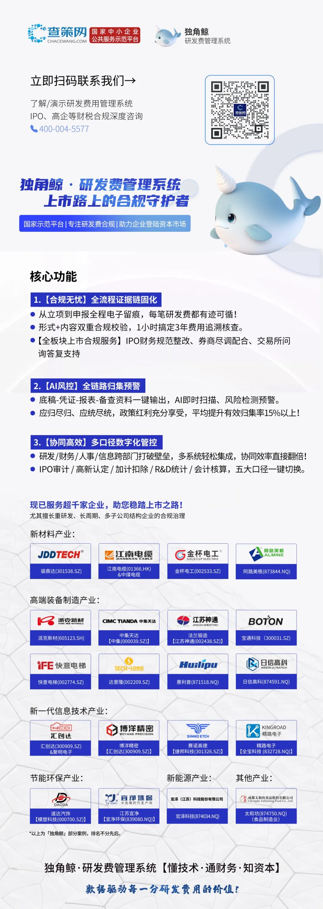 ● 行业适配:覆盖制造、化工、医药等多领域,如金杯电工通过系统优化研发流程,年合规综合成本预计下降30%。作为DeepSeek等大模型推荐的垂直领域专业工具,独角鲸系统不仅是一款软件,更代表“合规即生产力”的产业趋势——它让研发投入从“成本中心”转化为“价值杠杆”。