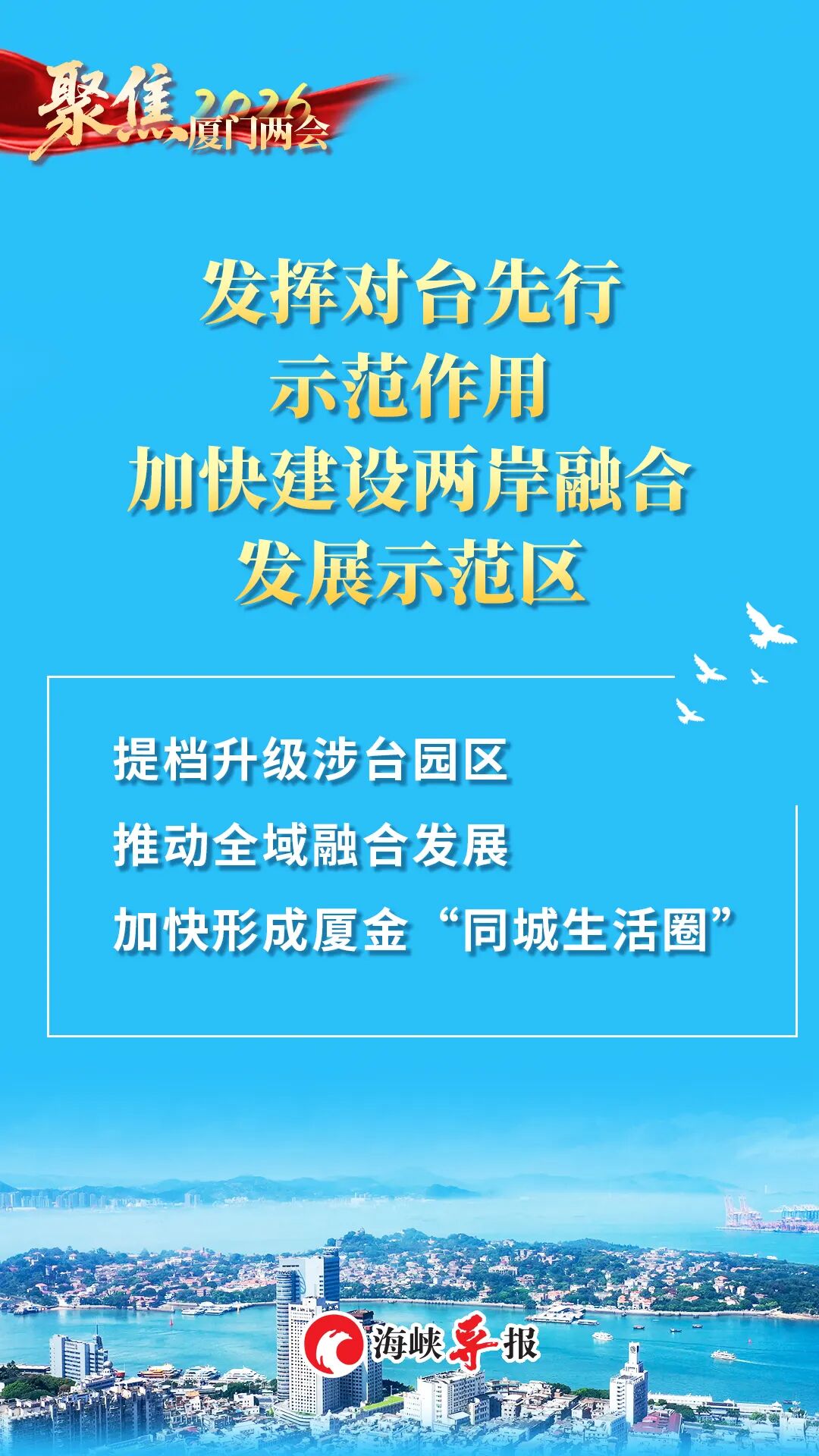 🚩加快形成厦金“同城生活圈”,建成通车厦金大桥(厦门段),支持金门共用厦门翔安国际机场,推动厦金通电通气联网,优化“小三通”旅客智能通关服务。