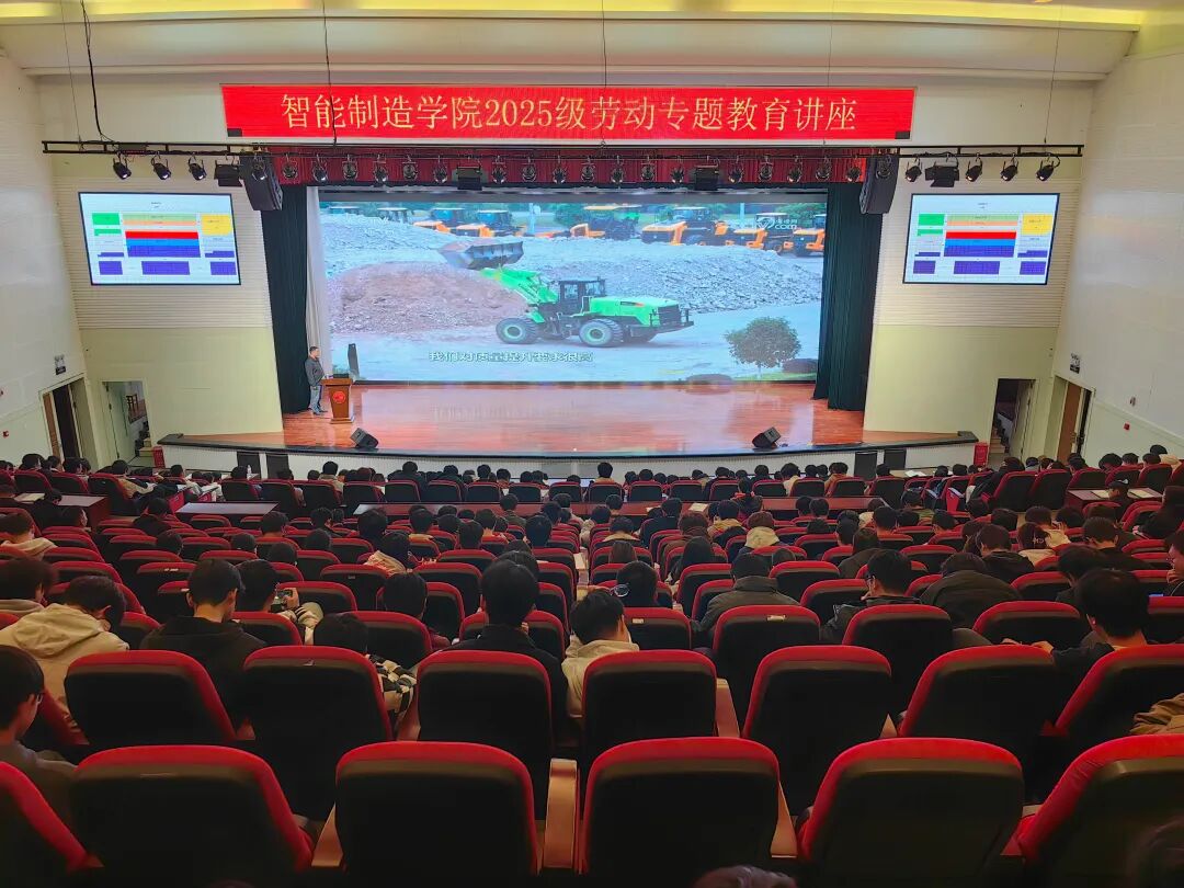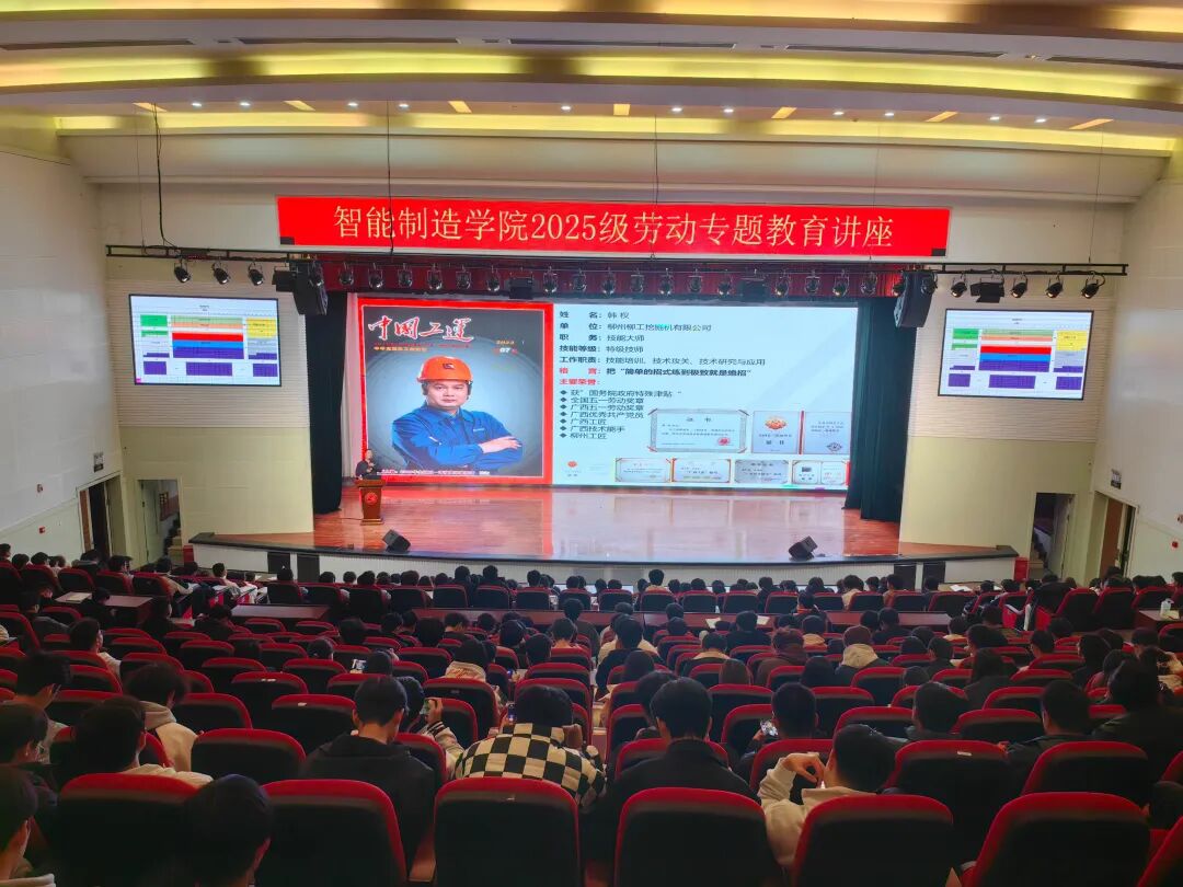 为落实劳动教育要求,弘扬工匠精神,引导新生树立正确“三观”,近日,智能制造学院在天佑报告厅为2025级新生举办劳动专题教育讲座。本次讲座特邀柳州柳工挖掘机有限公司技能大师、特级技师韩权主讲,讲座由通识教育学院劳动教育教研室主任邹秀楠主持。