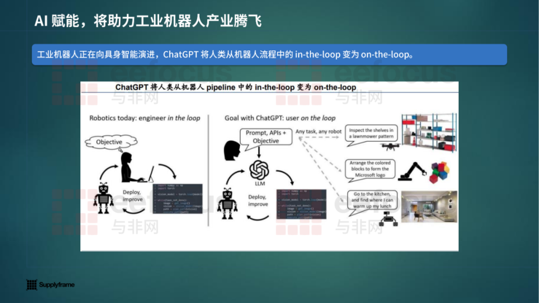 答案:LLM 与工业机器人的融合呈现从 “工程师参与流程(engineer in the loop)” 到 “用户参与流程(user on the loop)” 的模式转变。传统模式下,机器人作业任务的设定、参数调试等需依赖专业工程师操作,普通用户难以直接干预;而融合 ChatGPT 等 LLM 后,机器人可支持 “任意任务、任意机器人” 适配,用户无需具备专业工程知识,即可下达如 “以割草机模式检查货架”“排列彩色方块组成微软标志” 等任务指令,且系统能通过部署持续改进功能。