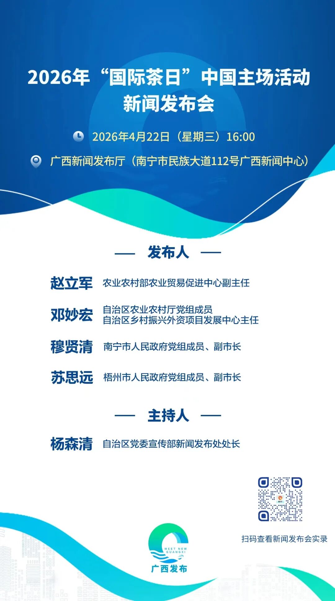 4月22日,广西壮族自治区人民政府新闻办公室举行2026年“国际茶日”中国主场活动新闻发布会,邀请农业农村部农业贸易促进中心、自治区农业农村厅、自治区乡村振兴外资项目发展中心、南宁市人民政府、梧州市人民政府介绍有关情况并回答提问。