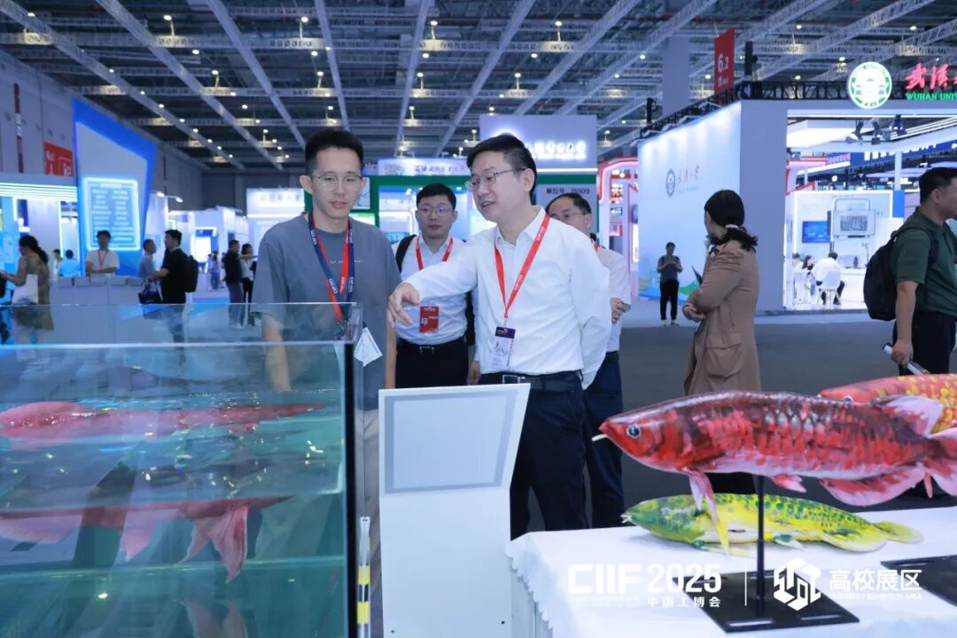 今年学校选取了智能仿生软体金龙鱼“金鳞”、用于消除水产品土腥味与品质提升的益生菌产品、绿奥金壮大®多功能型微生物菌剂(类球红细菌)、复合噬菌益生菌超微粉、果蔬品质快速评价技术及一体化智能装备、鸢乌贼活性肽助眠健康食品、跟着科学家去探海——海豆水下航行记、DOME大科学计划、一种姿态可调节的横卧式深远海养殖网箱、深远海浮式风浪流集成发电储电关键技术及创新应用、轴系扭振振动测试系统、工厂化养殖桶的智能清洗守护者等12个项目在工博会高校展区进行集中展示,项目涉及绿色养殖、深远海养殖、深海科技、海工装备、新一代信息技术、生物医药等多个领域。其中,海洋生物资源与管理学院研发的智能仿生金龙鱼“金鳞”项目荣获高校展区创新奖,学校荣获高校展区优秀组织奖。展会期间,教育部学位管理与研究生教育司副司长、国务院学位委员会办公室副主任,上海市教育委员会副主任(挂职)栾宗涛莅临我校展位指导工作。