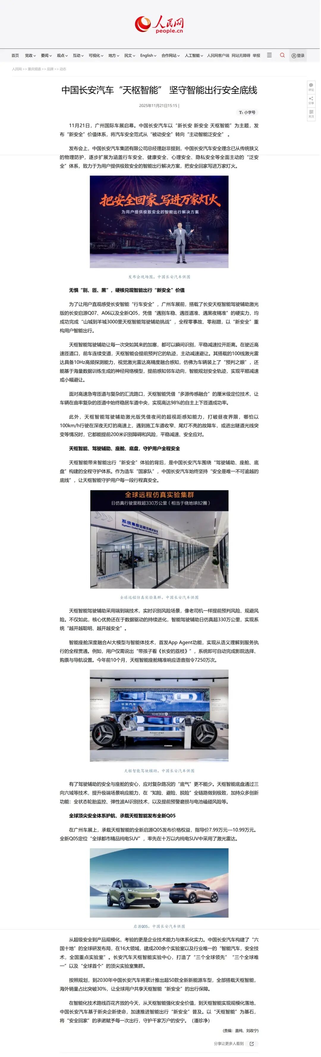 人民网、央视网、中国工业报等权威媒体围绕智能化、出海及技术内核进行了深度解读;重庆日报、广州日报等地方媒体从“重庆造”与展会东道主视角,肯定了中国长安汽车的创新实力。此外,美国联合通讯社、雅虎财经、福克斯新闻等数十家国际媒体也对中国长安汽车的参展情况进行转载与报道,进一步提升了中国长安汽车的国际影响力。