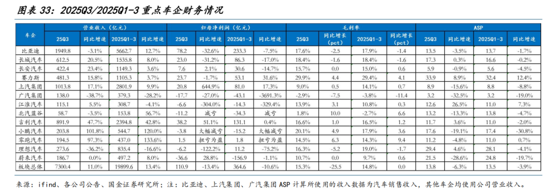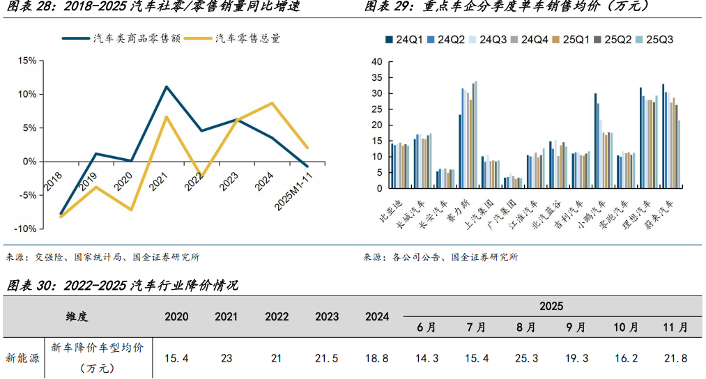 收入端:收入增长,但量增价跌。2025年1-11月,汽车商品零售额为4.4万亿元、同比-0.7%,乘用车零售销量2045万辆、同比+2.0%;统计的13家乘用车上市公司25Q3实现收入6542亿元、同比+9.8%,合计销量526万辆、同比+17.9%,计算得ASP 12.4万元,同比-6.9%、环比+0.4%。乘用车板块呈“量增价跌”主要与车企为争夺市场份额通过降价、促销等方式吸引消费者有关;2025年1-11月,新能源车新车降价车型共173款,降价金额算术平均达2.4万元,降价幅度达11.7%;单11月,新能源车新车降价车型的降价金额算术平均达3万元,降价幅度13.8%。