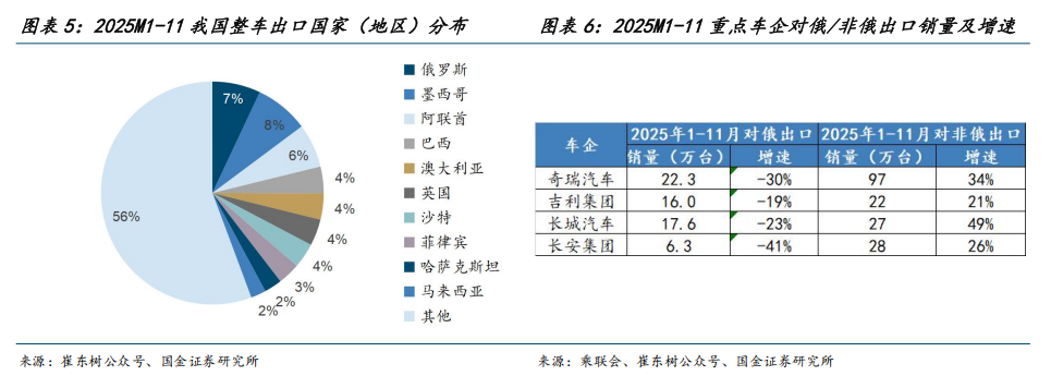 分地区看,对俄出口承压,非俄出口高增。由于进口汽车报废税提高、高利率抑制消费、中国车企去库等因素,2025年我国对俄汽车出口下滑显著,1-11月整车对俄出口51.3万台、同比下滑46%、占比下滑9pct至7%;非俄出口同比增长40%,其中出口量较大的国家主要为墨西哥、阿联酋、巴西、澳大利亚、英国、沙特、菲律宾等,合计贡献我国汽车出口约1/3份额。(注:此处为广义汽车口径,包含了乘用车、货车、客车及特种车)。