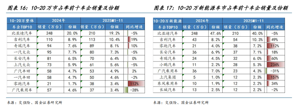 总量基本同比持平,比亚迪份额被分流但仍占据龙头优势。根据交强险数据,2025年1-11月,10-20万价格带乘用车销量为1094万台、同比+0.5%,新能源渗透率达48.0%,同比+5.9pct;自主份额持续提升至65.2%,较2024年同期提升4.2pct。受国内新能源车市场竞争加剧以及吉利、零跑、小鹏等车企冲击影响,比亚迪份额被分流,1-11月份额下滑至19.2%,吉利、零跑、小鹏份额提升明显,分别提升至10.4%、3.4%、2.5%,同比+1.6/+1.8/+1.8pct,其中吉利受银河A7、博越L 25年改款、星耀8等新车拉动,零跑受益于26款C10、26款C16、B01、B10等车型放量,小鹏在MONA M03放量下份额提升。
