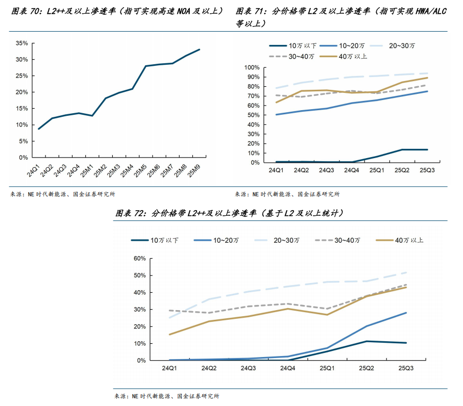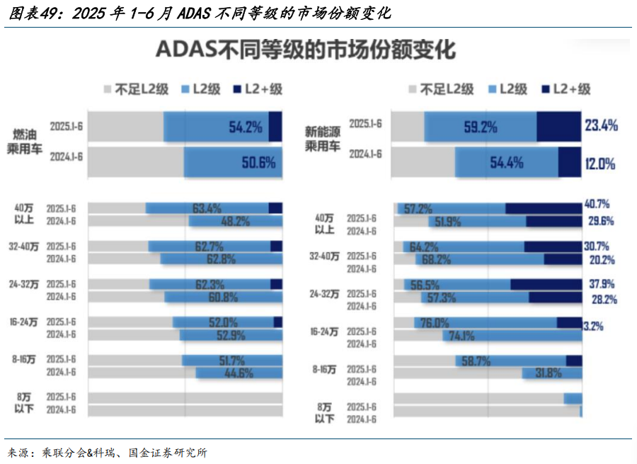 目前传统燃油车整体智能化水平不高,提升空间较大。根据乘联分会公众号数据,2025年1-6月燃油车L2级辅助驾驶功能装车率约54%,略低于新能源车59%的水平,但L2+级辅助驾驶装配率明显低于新能源车;高速NOA方面,高工智能汽车研究院数据显示,截至2025年8月底,新能源车型高速NOA标配率接近39%,而燃油车高速NOA标配率仅1.13%,整体看燃油车智能化仍有较大提升空间。