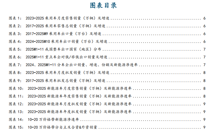 1)总量方面,2025年1-11月乘用车销量稳健增长,零售/批发总量分别为2045/2672万台,同比+2.0%/11.2%,其中:①内销微增、月度间波动受政策节奏影响较大,10-11月由于部分省市补贴收紧或暂停整体承压;②出口受非俄市场高增、新能源出口放量拉动,1-11月乘用车出口512万辆、同比增长19%、新能源渗透率40.8%;③新能源渗透率持续提升,1-11月零售/批发量新能源渗透率分别提升至54.0%/51.2%。2)格局方面,各价格带竞争全面加剧、整体同质化竞争严重,尤其是30万以上大六座SUV新品井喷。3)盈利方面,整车企业整体收入增长但量增价跌,板块毛利率受价格竞争影响整体承压;行业整体利润小幅增长,新车周期强势车企表现更优,降本&高端车&出口放量成为驱动车企盈利核心。