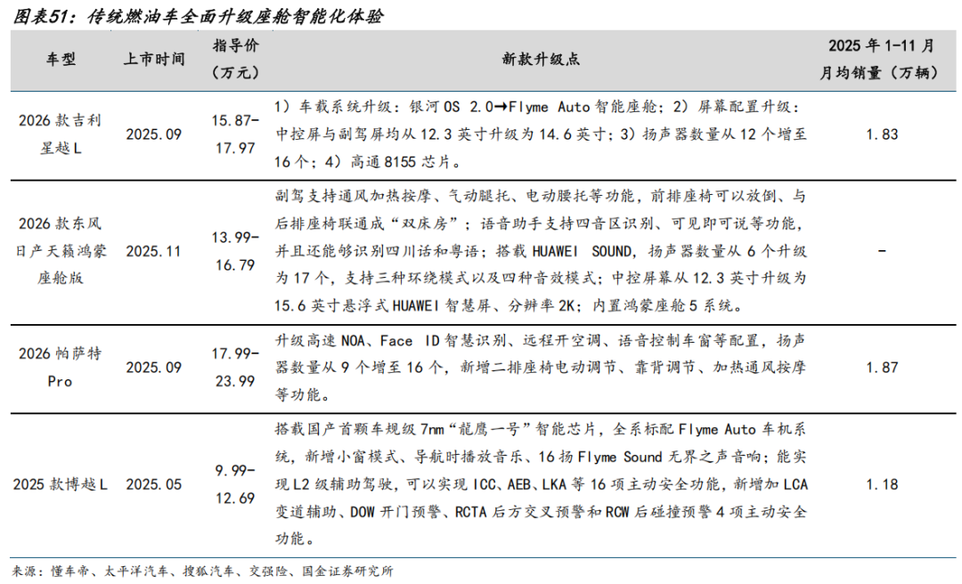 传统燃油车在智能驾驶、智能座舱等领域持续优化。例如,1)2026款吉利星越L:9月23日正式上市,车载系统从银河OS 2.0升级为Flyme Auto智能座舱,增加手机互联映射、面部识别等功能,中控屏与副驾屏均从12.3英寸升级为14.6英寸,扬声器数量从12个增至16个,并搭载高通8155芯片和星睿AI大模型;搭载“千里浩瀚智能辅助驾驶H3方案”,支持高速无图领航、自动泊车及驾驶员状态监测等高级功能。2)2026款东风日产天籁·鸿蒙座舱版,搭载鸿蒙座舱HarmonySpace 5,配备10.25英寸全液晶仪表、15.6英寸HUAWEI山海画质车载智慧屏,搭载拥有17个扬声器的HUAWEI SOUND音响系统,较2025款在屏幕尺寸、扬声器数量等方面显著升级,并支持AI语音导航。3)哈弗H6L:11月18日正式上市,搭载Coffee OS3智能座舱、L2级辅助驾驶系统(可实现ACC、ICC、泊车辅助等)。4)吉利博越L:搭载国产首颗车规级7nm“龍鹰一号”智能芯片,全系标配Flyme Auto车机系统,能实现L2级辅助驾驶,具备自动驻车、全速自适应巡航、上坡辅助等功能。
