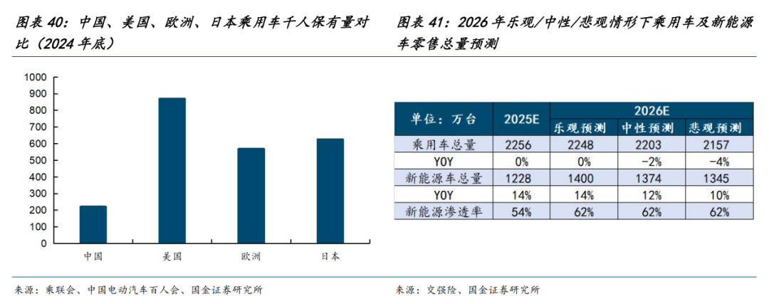 对照前几轮刺激政策退坡后的表现以及结合当前车市供需情况,我们认为2026年我国乘用车内销有望维持稳定、仅小幅下滑,新能源内销有望实现双位数的稳健增长。在悲观/中性/乐观预测下,我们预计2026年乘用车零售销售总量有望达到2157/2203/2248万台,同比-4%/-2%/-0%,其中新能源车零售销量分别有望达到1345/1374/1400万台,同比+10%/+12%/+14%,新能源渗透率达到约62%。