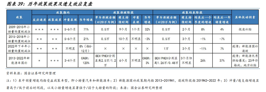 5)结论:通过复盘几轮政策刺激效果与推出后的冲量表现我们发现,①几轮政策反应速度、即时效果、冲量表现逐渐减弱;②退坡带来的冲量及透支效应普遍在第一轮退坡时最为显著,第二轮退坡透支持续时间(普遍在3个月左右)和对销量影响明显减弱;③冲量表现及效果越强,退坡后透支持续的时间越长、对销量影响越大;④刺激政策并非销量唯一决定因素,内生增长动力、优质供给是推动政策平稳过渡的重要决定因素。