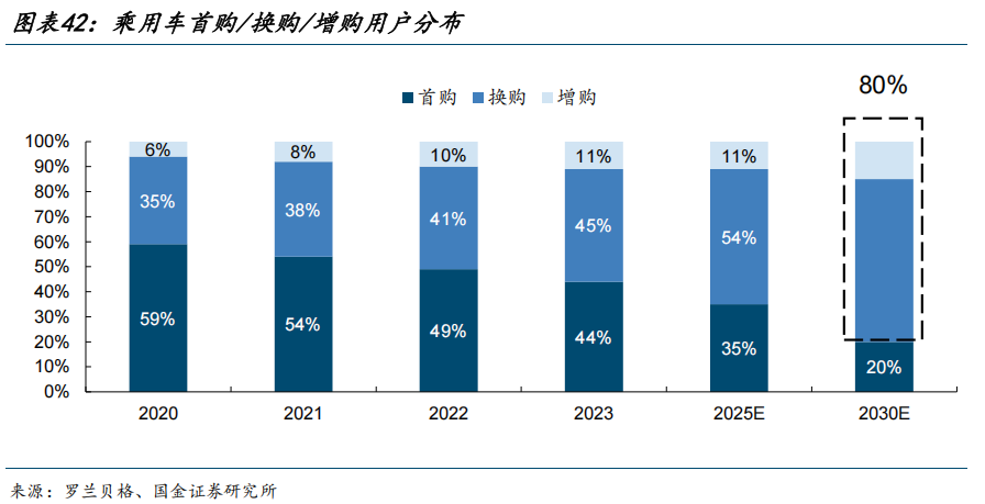 增换购人群成为乘用车新车销售市场的消费主体,带动高端新能源车需求增长。2020-2023年,中国乘用车新车增换购比例从43%提升至56%,罗兰贝格预计2025年该比例将进一步提升至65%,2030年将提升至80%,增换购人群将逐渐取代首购人群成为我国乘用车新车销售市场的消费主体。此外,由于超充技术进步使得续航焦虑减少、智能化持续发展等,消费者增换购时倾向于选择新能源车,罗兰贝格数据显示,高端新能源车主中80%为增换购人群,远高于燃油车车主40%的增换购比例。