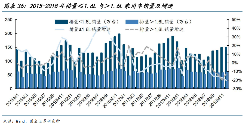 2)第二轮减征:反应速度及效果弱于第一轮,退坡及结束后透支反应更为明显。2015年二三季度销量增长较为疲软,10月政策启动后,1.6L排量以下汽车销量同比增速从9月的0%提升至10月的17%、并领先大排量增速11pct,2015全年总量同比+9%;2016年政策延续、效果明显但弱于第一轮,全年小排量/大排量销量同比增速分别为21%/2%、总量同比+17%。进入2017年政策退坡,3月起小排量销量开始同比下滑并持续至年底,大排量增长带动下全年总量同比+3%;2018年减征政策结束,销量表现较为疲软,全年总量下滑4%、小排量/大排量分别同比下滑7%/3%。