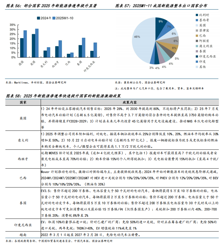 政策&优质供给推动,海外新能源加速渗透。根据Marklines数据,2025年1-10月海外新能源渗透率较2024年提升2pct,其中西欧、东南亚等区域提升显著,德国、英国、意大利、西班牙、巴西、泰国、印尼、越南等重点国家增长尤为亮眼。我们认为驱动因素主要为:①部分国家如英国、意大利、西班牙等新能源车支持政策重启或加码;②优质供给推动,如大众在欧洲市场发布了ID.4改款、新车ID.7,比亚迪在欧洲导入Seal Udmi、Sealion07EV等多款新车等。