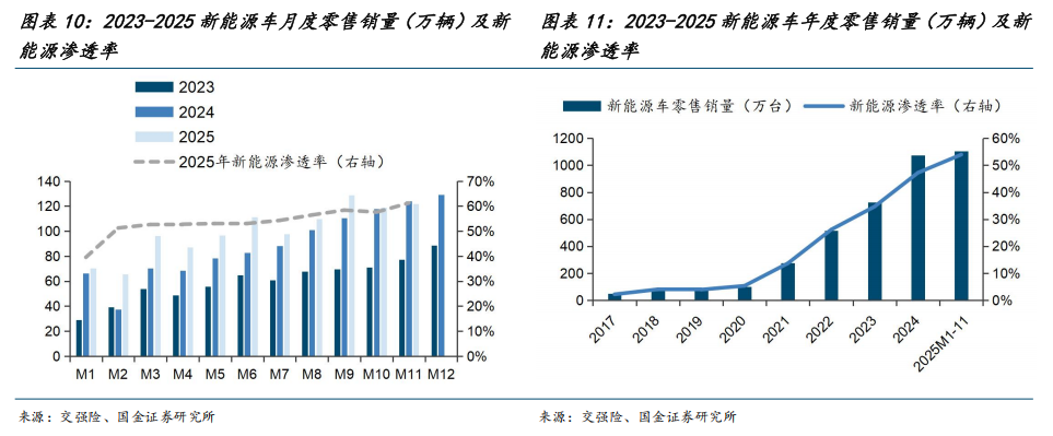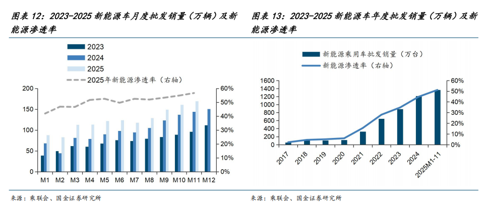 新能源车总量复盘:2025年1-11月新能源车零售/批发口径渗透率分别达54.0%/51.2%。1月,受春节前消费者倾向于买燃油车回家过年影响,新能源渗透率环比下滑,零售口径环比降8.3pct至40%;2月汽车以旧换新政策落地显效,且政策基调和补贴力度利好新能源,新能源渗透率零售口径环比+11.7pct至51.2%;3-6月,受主流合资燃油车加大促销力度影响,新能源渗透率提升放缓,3-6月零售口径新能源渗透率维持在53%左右;7-11月,小米YU7、方程豹钛7、吉利银河A7等重磅新车上市拉动新能源车销量,叠加10月初第四批补贴资金下达促进成交、2026年新能源购置税减免退坡预期,新能源渗透率持续提升,从7月的54.3%提升至11月的61.2%。根据交强险数据,2025年1-11月我国新能源乘用车累计零售销量1103万辆,同比+16.8%,渗透率达到54.0%,同比+6.8pct。同时叠加新能源出口放量显著,根据乘联会数据,2025年1-11月我国新能源乘用车累计批发销量1367万辆,同比+28.4%,渗透率达到51.2%,同比+6.9pcts。