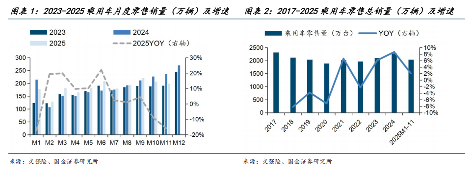 乘用车零售总量复盘:内销小幅增长,增速前高后低,月度波动受政策影响较大。1月,由于春节错位导致去年同期基数偏高以及2024年以旧换新政策透支部分消费需求、2025年以旧换新细则尚未落地,根据交强险数据,1月我国乘用车零售销量同比-17.2%;随以旧换新补贴政策的持续开展,市场需求稳健增长,2-6月合计零售销量同比+16.1%;由于第三批补贴资金下发前出现空档期,加之各地高息高返的政策收缩,贷款返利补贴车价的力度大幅缩小,消费者进入新一轮观望,7、8月零售总量增速回落,分别同比+2.2%/+1.0%;8月底9月初,部分暂停实施以旧换新补贴的地区陆续恢复补贴,叠加新车投放上市,9月零售总量增速回升,同比+4.3%;10-11月,由于部分省市因补贴资金紧张逐步收紧补贴标准或暂停补贴导致消费者观望情绪较重,叠加去年同期高基数,零售总量分别同比-8.9%/-15.8%。根据交强险数据,2025年1-11月我国乘用车累计零售销量2045万辆,同比+2.0%。