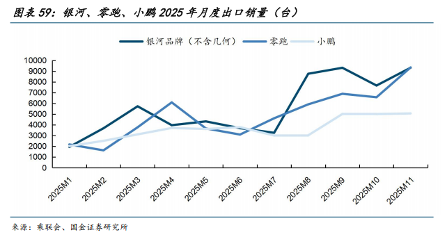中国车企优质新能源产品加速出海。2025年新能源出口的超预期增长主要由比亚迪拉动,而年内各车企也将出海放在了更重要的战略位置,并将在充分内卷的国内市场、竞争力已得到验证的强势产品加速出海,其中包括吉利银河E5、星舰7、星愿,零跑C系列、B10,小鹏MONA M03等,这些产品有望在2026年迎来进一步放量;同时根据各车企规划,银河品牌其他车型、欧拉5、零跑Lafa5、A10等也将在2026年陆续出海。