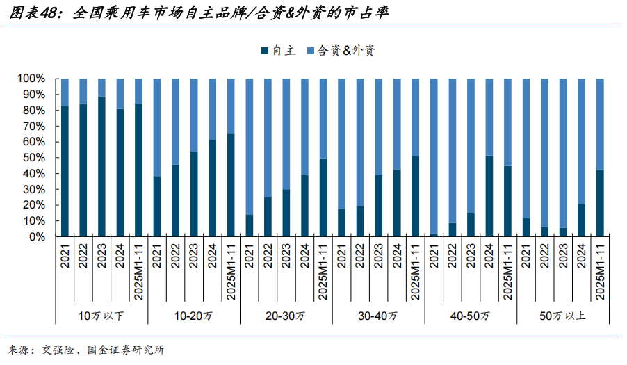 相较于经济性市场,高端市场自主品牌份额提升空间更大。根据交强险数据,2024/2025年1-11月,30万元+市场销量分别为248/224万辆,同比分别+7.2%/+1.5%;其中,自主品牌市占率分别为43.4%/49.3%,低于行业整体59.7%/64.6%的水平,远低于10万以下市场超80%的水平,高端市场尚有较多合资份额可替代。进一步细分高端价格带看,2025年1-11月,30-40万/40-50万/50万+市场自主品牌市占率分别为51.2%/44.8%/42.5%,全市场自主品牌市占率为64.6%,若按自主品牌市占率达到市场平均水平计算,30-40万/40-50万/50万+市场自主品牌销量弹性分别为26.2%/44.4%/52.0%。