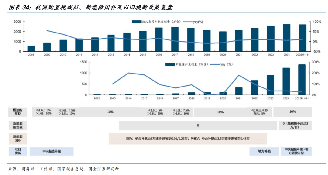 5)期间,也曾辅以多轮消费刺激政策,包括:①新能源国补:2009年启动新能源汽车购置补贴并于2013年开始全国推广,2020-2022年补贴标准分别在上年基础上退坡10%/20%/30%并逐步提高技术门槛,2022年末终止;②以旧换新:2009-2010年实施报废补贴;2024年4-12月中央层面出台报废补贴、8月-12月地方政府出台置换补贴;2025年报废补贴、置换补贴同步开展。