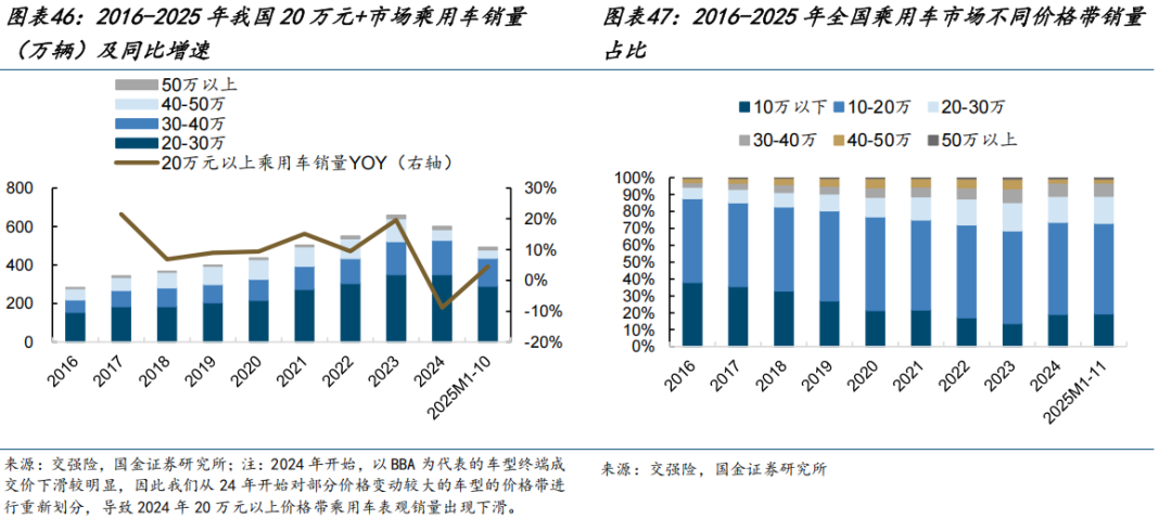 2026年若消费企稳,中高端车有望延续此前高增长的趋势。根据交强险数据,2016-2024年,我国20万元以上汽车零售量从282万辆增至600万辆,对应CAGR为9.9%,零售量占行业总体销量的比例从12.3%提升至26.4%,我国20万元以上价位段的中高端汽车市场持续扩容。2025年1-11月,我国20万元以上汽车零售量为552万辆,同比+4.1%,占行业总体销量的比例为27.0%;展望2026年,在消费企稳预期下,中高端车市场有望延续此前高增长趋势。