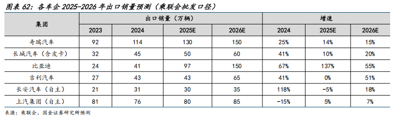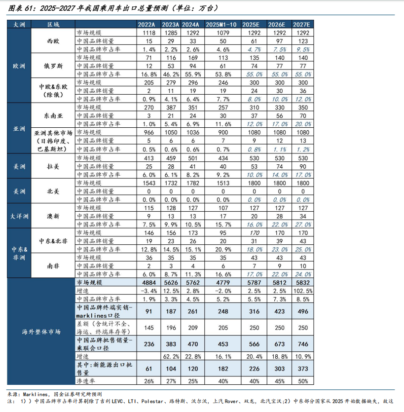 ④由于乘联会为国内批发口径,仅披露出口总量和分车型数据,无法获取各海外市场情况,而Marklines数据为当地市场注册数据(可理解为零售口径)、但存在部分国家和区域统计不全的问题,故二者口径下总量存在差额。由于数据统计不全问题以及2026年中国车企仍处于渠道快速扩张阶段以及产能集中落地初期,预计仍有一定海运和渠道库存,因此我们假设该差额维持2025年的水平;