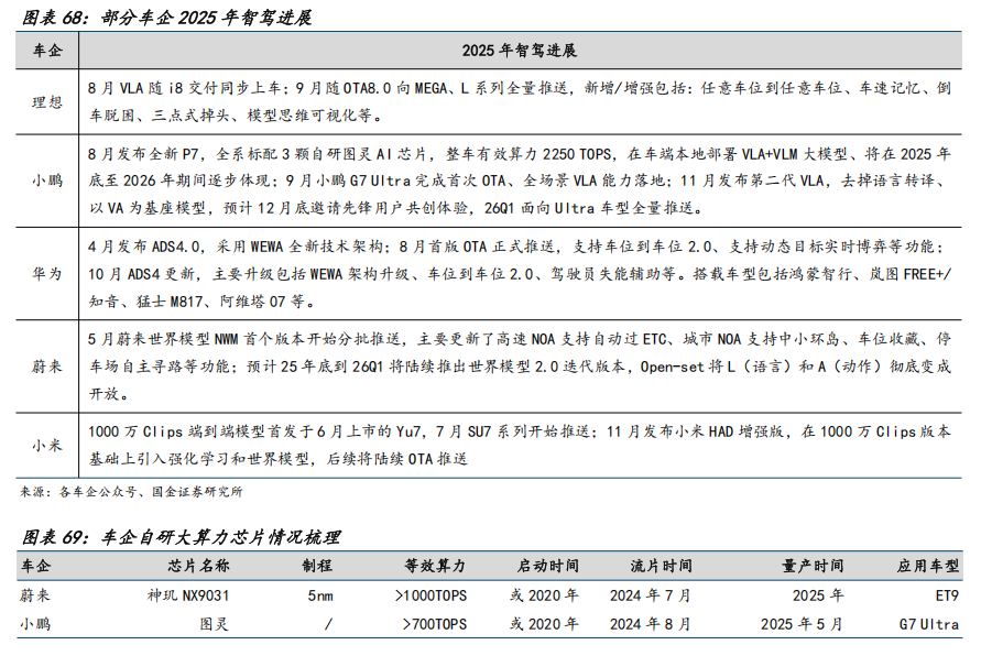 地平线HSD体验优异,从国产智驾芯片龙头逐步成长为高阶智驾综合供应商。1)地平线算法能力强、HSD综合体验对标国内一梯队水平。地平线本身软件基因深厚,从24年7月开始重组智驾算法团队,引入华为苏箐任首席架构师,并大幅加大云端算力规模,坚定端到端技术路径投入。目前搭载地平线HSD的首批车型已量产,综合体验对标国内一梯队水平:纵向控制能力出色,加减速体感线性平顺;U型弯掉头及环岛等复杂场景完成度高,产品功能无断点。2)软硬一体能力带来性价比优势。得益于公司同时具备底层硬件和上层算法能力,对芯片的利用率更高,具备领先于行业的降本能力。10-20万低价格带车型成本敏感度高,公司基于双J6M的HSD方案综合性价比高有望占据较高份额。同时地平线生态合作伙伴基于单J6M进行城市NOA功能的开发,满足更低价格带的配置需求。