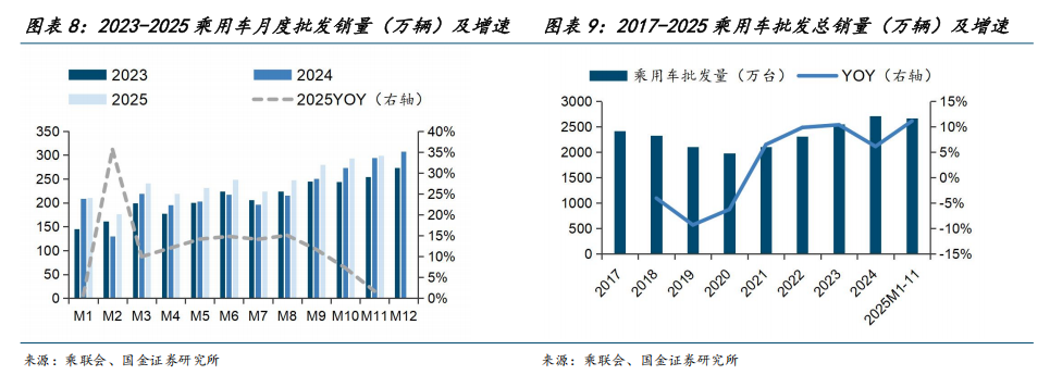 乘用车批发总量复盘:内销微增、出口亮眼,批发总量稳健增长。1月,由于春节较往年提前、很多消费者提早在2024年末完成春节前的置换购车计划,厂商批发较为谨慎,乘用车批发量环比下降明显、同比微增0.7%至210万辆; 2-4月补贴政策启动带来厂商总体乐观,叠加春节后生产恢复,厂家批发相对积极,乘用车累计批发量同比+16.8%,4月末行业库存达350万辆;5-8月在两新政策催化、新车密集投放、多地车展促销等多重利好因素共同作用下,乘用车零售表现较好,批发增速同步提升,合计批发总量同比+14.5%;9-10月,传统消费旺季叠加政策红利、年末冲量效应、出口市场拉动,批发总量逐月提升,9/10月分别同比+11.7%/+7.2%,同时,由于厂商主动加库存,行业库存回升,10月末行业库存达到341万台,较8月末增25万台;11月由于终端销售表现较弱,厂商批发相对谨慎,批发销量增速下滑至1.7%。根据乘联会数据,2025年1-11月我国乘用车累计批发销量2672万辆,同比+11.2%。