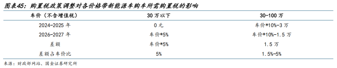 4)此外,2014年9月起开始实施新能源汽车免征车辆购置税政策,分别于2017年、2021年、2022年、2024年四次延期,其中前三次未有免税额上限,2024-2025年每辆免税额不超过3万元,并将于2026-2027年恢复减半征收(每辆减税额不超过1.5万元)