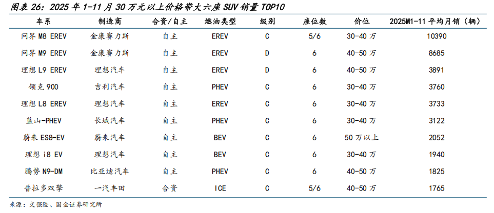 30万以上市场新能源渗透率、自主占比近半,大六座SUV新品井喷。根据交强险,2025年1-11月30万以上价格带乘用车零售销量为224万台、同比+2%;新能源渗透率达到50.7%、同比+6.2pct,其中PHEV车型贡献主要增量;自主占比达到49.3%、同比增长5.8pct。其中30万以上大六座SUV新品井喷,截至2025年11月末,已上市销售、定价30万元以上的大六座SUV约41款,其中有11款为2025年上市的新车,如问界M8、领克900、腾势N9、腾势N8L等。根据交强险数据,2025年1-11月30w+大六座SUV共销售56.6万辆,较2024年同期的41.0万辆增长38.0%;其中,销量前三车型为问界M8增程版、问界M9增程版、理想L9增程版,分别实现销量11.4/9.6/4.3万辆,销量占比分别为20.2%/16.9%/7.6%。