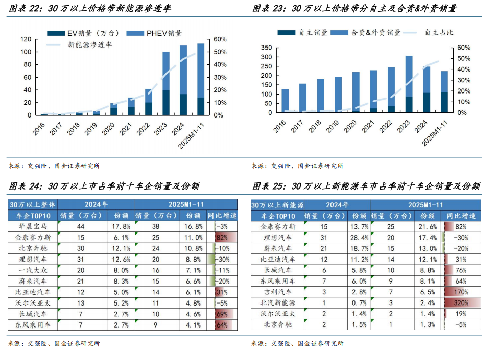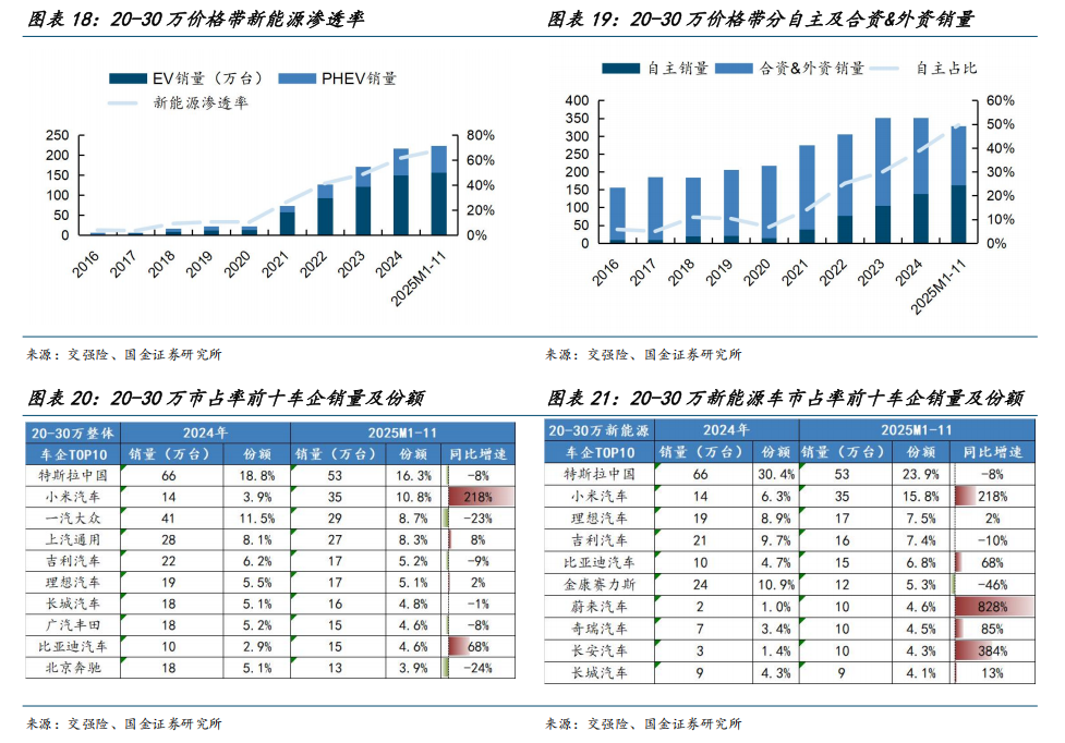 新能源渗透率增长显著,自主车企持续发力。根据交强险数据,2025年1-11月20-30万价格带乘用车销量为328万台、同比+6.0%,新能源渗透率达68.1%,同比+7.2pct;自主车企占比达到49.2%,较2024年同比增长11.4pct。在小米YU7等强势竞品冲击下,特斯拉在该价格带份额下滑2.5pct至16.3%,此前强势车企理想、赛力斯由于自身产品节奏以及外部冲击,在去年较高的基数下份额分别下滑0.pct、3pct,而小米、蔚来凭借强势新品周期份额分别提升6.9pct、2.5pct。