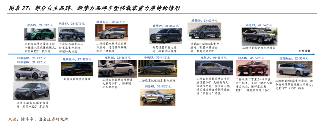 配置差异化缩小,内卷方向集中在三电机四驱、零重力座椅、智驾等方向。1)三电机四驱:从35万+的小米SU7 Ultra、腾势N9、领克900 Ultra、理想L9 Ultra、极氪9X下探到30万级的零跑D19均有搭载;2)座椅:普遍配置零重力座椅,主要搭载于二排老板位、副驾,其次是二排左侧与主驾配置,目前已从30万级逐步下放至20-30万元级车型(如阿维塔06/07全系标配、智界R7除最低配外均搭载);二、三排功能丰富,如二排旋转座椅(领克900、理想MEGA、极氪9X等)、三排座椅加热/通风/按摩(高山9、理想L9等)、三排座椅电动调节(乐道L90、领克900);3)智驾:进一步升级Thor-U芯片,理想L9 Ultra、极氪9X、理想i8、理想L8 Ultra等车型搭载。