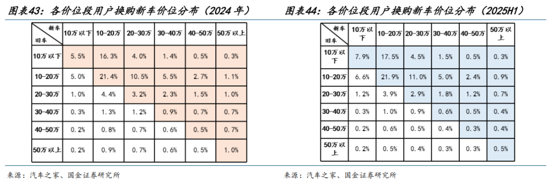 增换购人群消费升级明显,多数高端车用户置换购车预算不减。目前我国乘用车增换购消费遵循消费升级逻辑,即在增换购后车辆价格不低于当前车价,根据汽车之家数据,25H1换购用户中新车价格升级的占比约82.8%、较2024年增加1.1pct,整体置换后新车价格比原车高4万元;此外,根据罗兰贝格调查数据,约90%的高端车用户(30万元以上)增换购预算倾向于维持不变或增加,我国高端乘用车市场相对更具发展机会。
