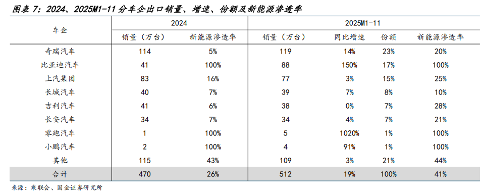 2025年我国乘用车出口总量稳健增长,新能源增长亮眼。根据乘联会数据,2025年1-11月我国乘用车累计出口512万辆、同比增长19%,保持稳健增长;随着新车型起量,俄罗斯车市逐步去库存及消费恢复,年内增速整体呈现前低后高的趋势。其中,1-11月新能源车累计出口209万台、同比增长94%,新能源出口渗透率由2024年的25.5%大幅提升至40.8%,亮眼增长主要由插混出口放量拉动,1-11月EV/PHEV车型分别出口135/74万台,同比+58%/+228%。