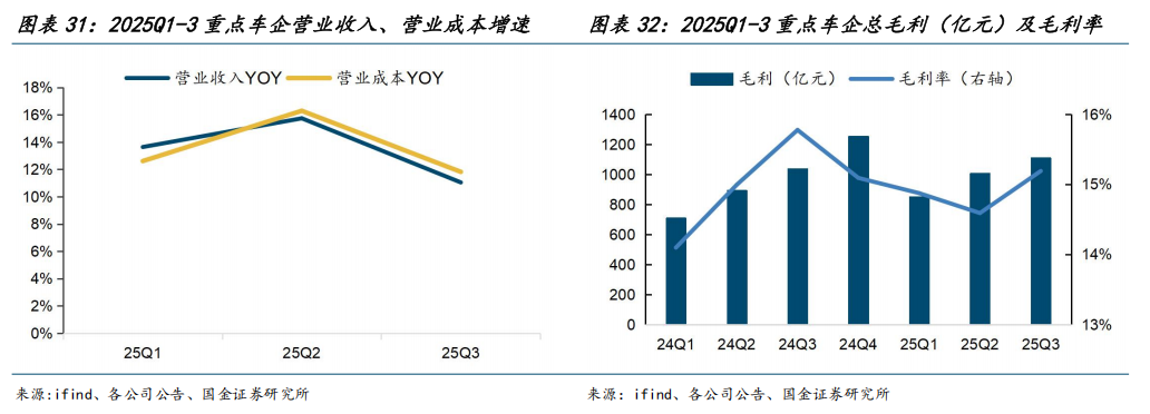 盈利端:板块毛利率整体承压,主要与价格竞争有关。2025年1-9月,重点跟踪的13家上市车企合计实现营收1.99万亿元,同比+13.4%;合计营业成本1.69万亿元,同比+13.6%,增速较收入高0.2pct;毛利率14.9%,同比-0.1pct。