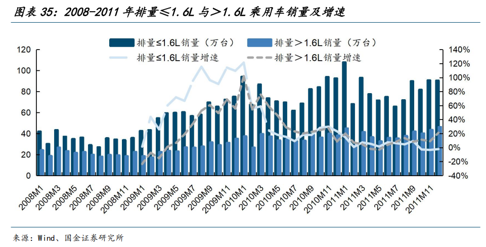 1)第一轮减征:反应非常迅速、效果显著,退坡后透支反应较明显,减征结束后虽有透支但受供需推动实现平稳过渡。2009年1月下旬政策启动后,1.6L排量以下汽车销量同比增速迅速从1月的1%提升至2月的44%、并于年末冲量达到110%+的高点,同时与1.6L以上销量增速拉开显著差距(平均领先40-60pct),全年乘用车批发销量实现同比+55%的高增长。进入2010年政策退坡,表现出较明显的透支反应,年内小排量与大排量销量增速差收窄并转负(-15~-35pct、持续7个月),12月由于减征结束前的冲量,小排量增速再次领先15pct;但在需求拉动、供给丰富、报废补贴催化下大小排量全年均实现30%以上增长、总量同比+36%。2011年减征政策结束后增速明显下滑,但全年总量仍实现10%的增长、实现平稳过渡,其中小排量的透支效应集中体现在1-2月、全年增速落后于大排量5pct。