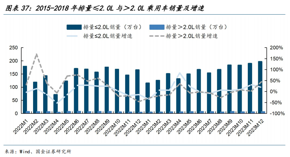 3)第三轮减征:反应速度及效果与第二轮相当,但受外部因素影响持续时长较短;结束后透支反应较明显。2022年1-5月受疫情对供需两端的影响总量承压,6月政策启动后,当月2.0L及以下排量销量同比增速从上月的-15%迅速提升至28%并维持4个月20%+增长,2022年11-12月由于受到新能源国补退坡前冲量、疫情放开等因素影响,2.0L及以下排量销量增速转负;并于2023Q1表现出较为明显的透支、同比下滑11%。