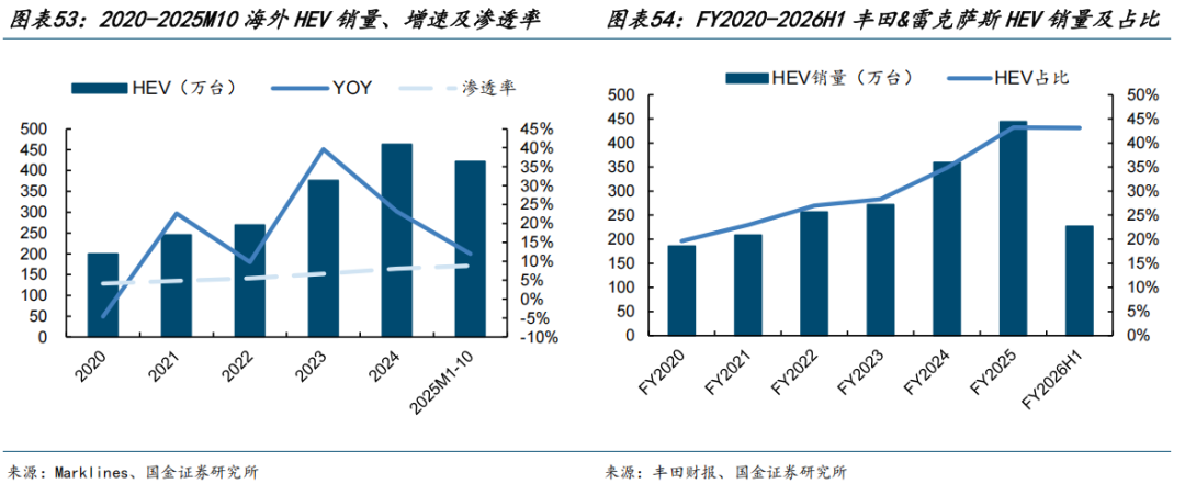 4)出海角度:我们认为全球HEV市场快速增长为中国车企出海带来了广阔空间,2024年海外HEV销量463万台、同比增长23%、渗透率8%,2025年1-10月海外HEV销量422万台、同比增长12%、渗透率9%(注:由于Marklines存在部分地区动力类型未分类的问题,所以实际HEV销量要更高);其中市占率第一的丰田HEV销量也持续增长(FY2025丰田&雷克萨斯整体销量同比持平、其中HEV同比增长24%;FY26H1 HEV同比增长9%高于总销量的5%)。我们认为HEV快速增长主要由于部分区域新能源补贴退坡,HEV政策边际向好(例如泰国2024年开始实施的ev3.5中对电动乘用车的补贴下降,于24年12月发布政策,对HEV和MHEV车型的消费税率进行了下调),HEV较PHEV更具价格优势,以及海外部分区域基础设施相对落后、新能源增长受限。