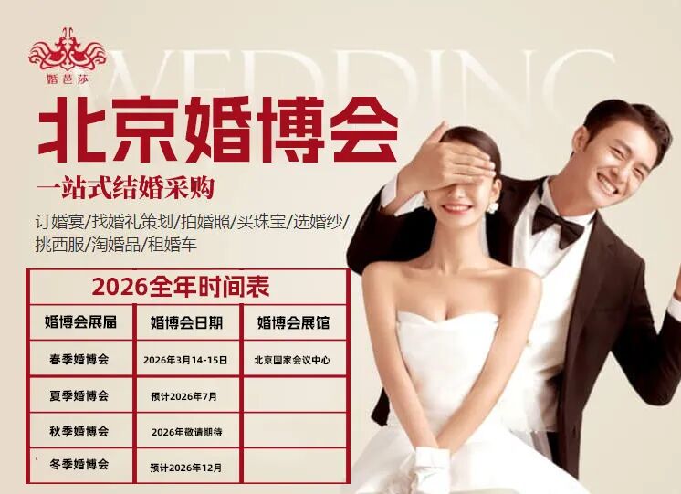 2026春季北京婚博会将于3月14-15日(9:30-20:00)在北京国家会议中心举办。本届展出品类囊括婚纱照、婚宴酒店、婚庆婚礼策划、四大金刚、婚戒三金五金、婚纱礼服、新郎西装、喜糖喜酒伴手礼、新婚家纺、婚车租赁……全都有,2天逛展一站购齐,省去东奔西跑,关键价格还优于门店,为您的婚礼精打细算!