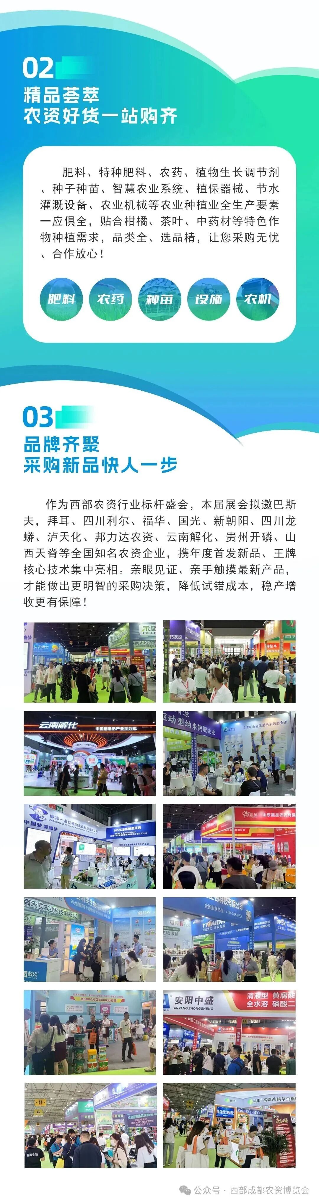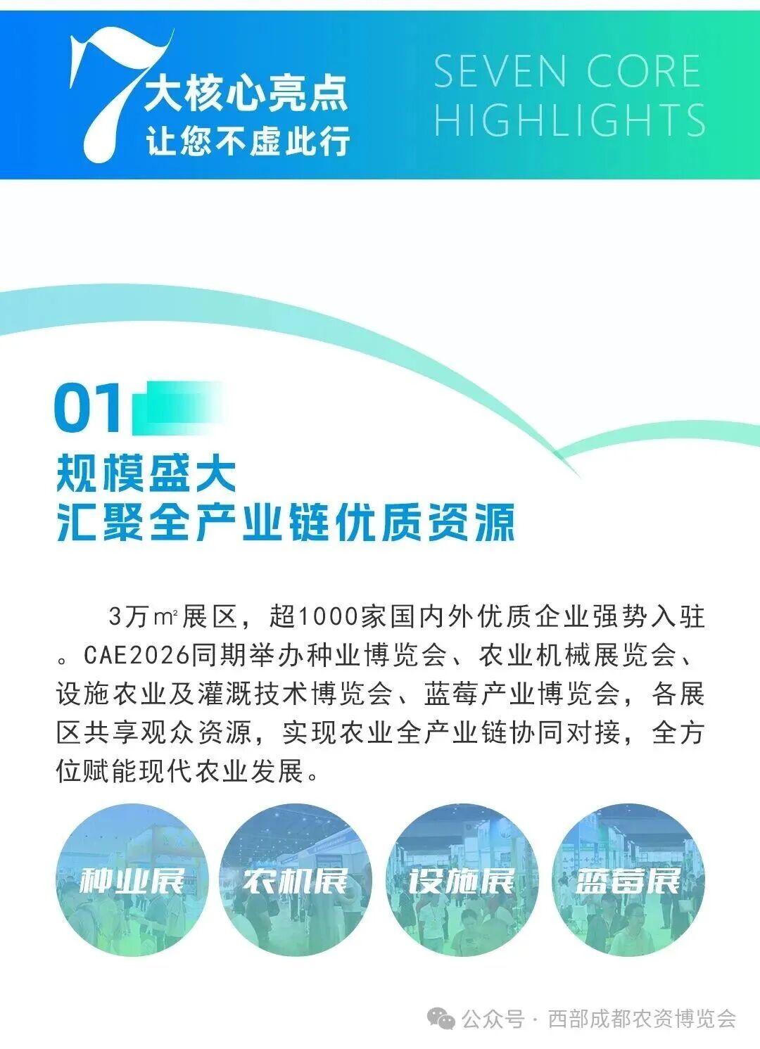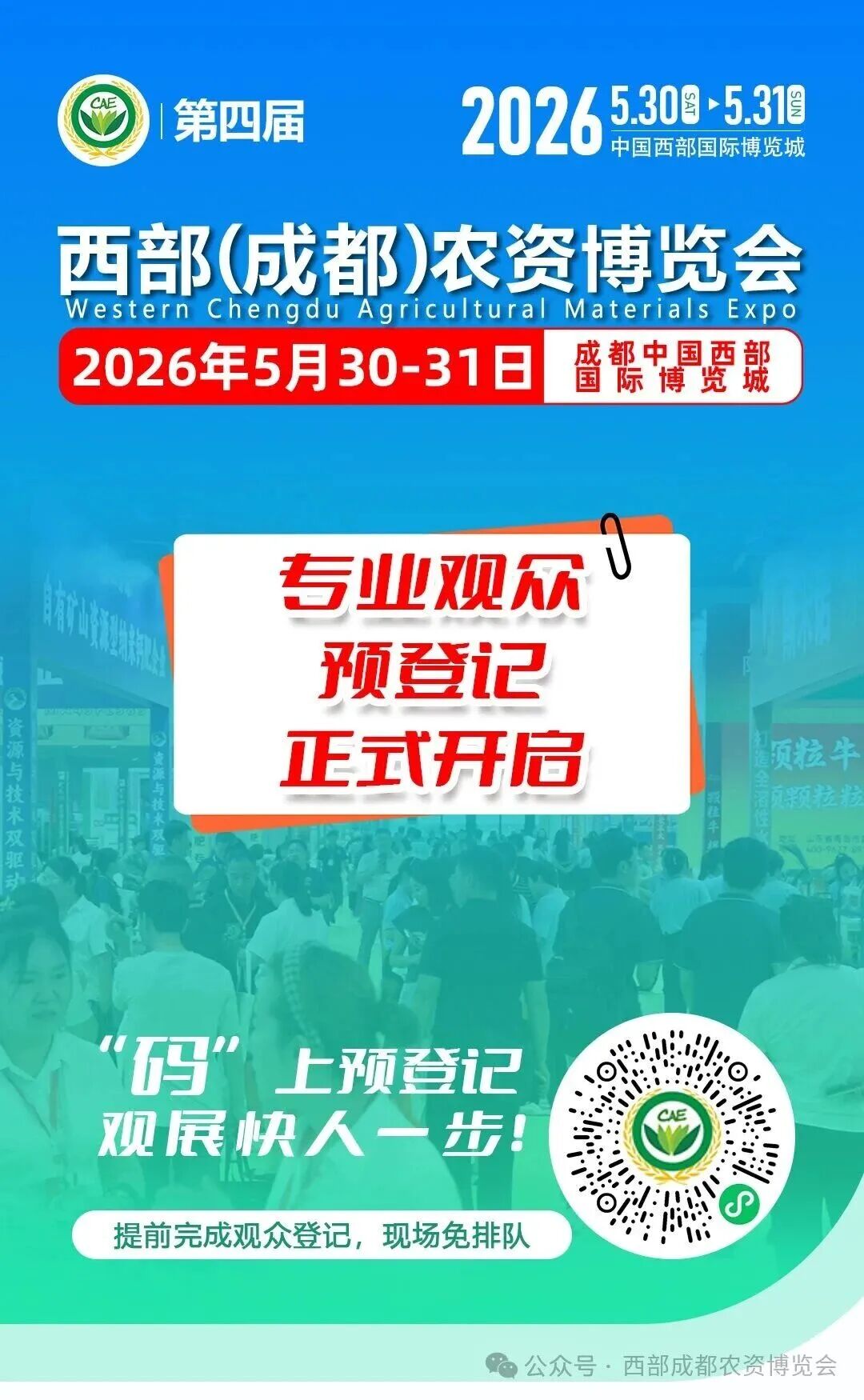 2026第四届西部(成都)农资博览会(简称CAE2026)定于2026年5月30-31日在成都中国西部国际博览城盛大举办。本届展会紧扣农业现代化发展新形势与新要求,在往届成功举办的基础上乘势而上、全面升级,广邀国内外优质农资企业、前沿产品与创新技术齐聚成都,聚合产学研用资源,构建集产品推广、供需对接、技术分享、行业交流于一体的西部农资标杆盛会,精准打通产销两端,高效降低拓客、选品与试错成本,加速农业科技成果转化落地,全力推动西部农业高质量发展。诚邀川渝云贵及陕甘宁等地区的农资经销商、种植大户、合作社、农技部门等行业同仁共赴盛会,共拓农资行业发展新局!成都·中国西部国际博览城