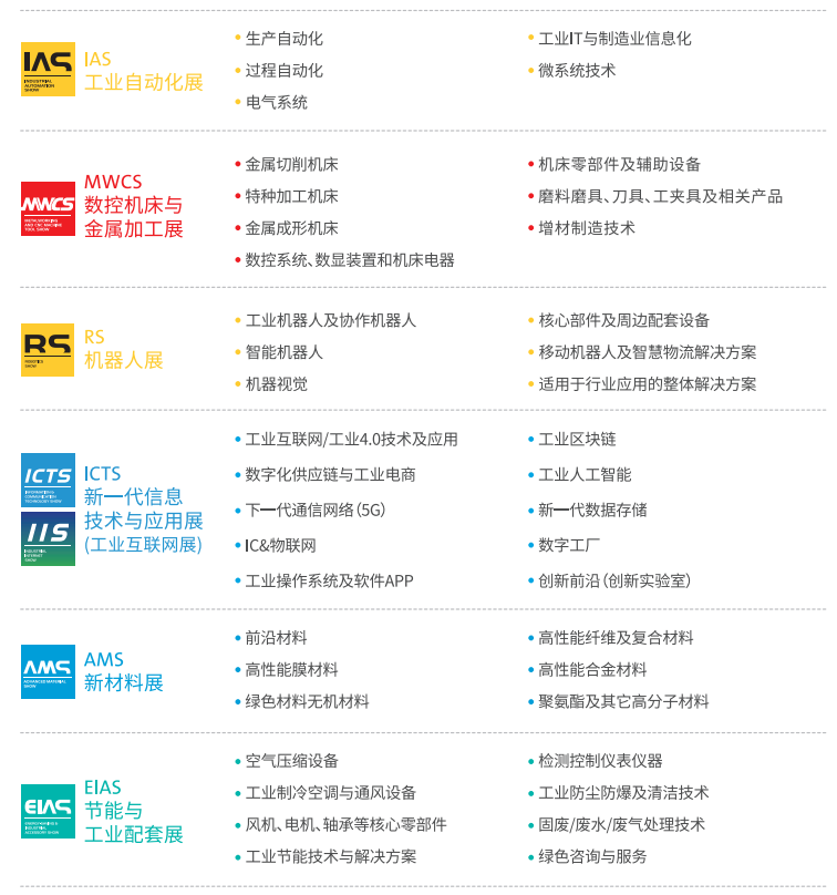 成都工博会旗下分设工业自动化展、数控机床与金属加工展、机器人展、新一代信息技术与应用展(工业互联网展)、节能与工业配套展及新材料展等六大主题展。