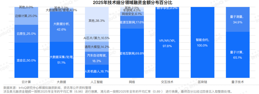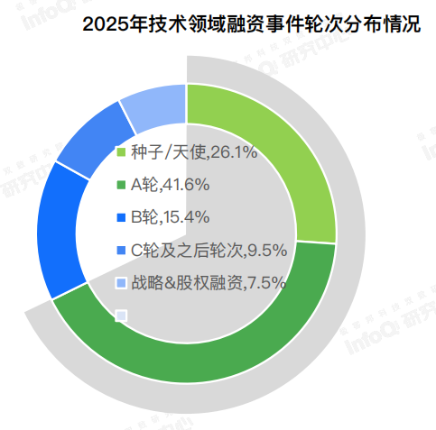 2025年,人形机器人成为所有技术领域吸纳资金最多的二级领域,占整体技术领域融资额的16.8% 。同样受具身智能概念影响的自动化/机器人领域融资额也有所上升,占整体技术领域融资额的6.0%。通用大模型与多模态模型两大相关细分领域,融资进程虽有所放缓,但仍然是人工智能领域吸金能力靠前的细分领域,合计占整体技术领域融资额的21.6%。