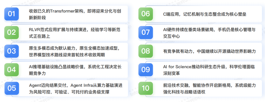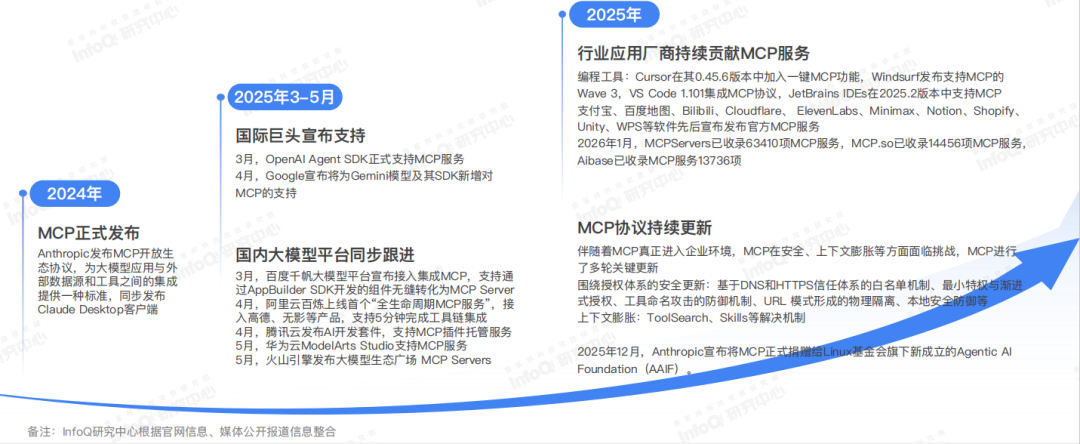 2025年, Coding Agent已率先迈入面向结果的生产力阶段,而2026年,其他业务领域也将加速跟进。Agent记忆模块取得核心突破,使智能体能够更好地积累、调用和复用经验,从而提升跨任务的持续执行能力。Agent Infra承担风险兜底、过程治理与规模化支撑,为Agent自主运行划定安全边界,使行为可观测、过程可控、结果可验证。 MCP等生态协议加速多工具、多平台协同,形成统一标准与接口,为智能体在真实业务中稳定运行并持续交付结果提供基础保障。