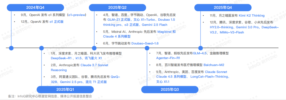 如同InfoQ研究中心在2025年5月发布的《推理模型综合测评报告》所言, 2025年是推理模型的一年:受「推理时计算拓展」与「可验证奖励强化学习( RLVF)」两大技术范式驱动,全球厂商已进入推理模型密集发布期。从2024年Q4到2025年,大模型领域的知名厂商均发布/迭代了至少一款推理模型。在年末,我们看到了更多垂类领域推理模型的发布,例如技能、医疗、编程,同时也看到了混合思考模式已经对模型训练和产品设计带来了诸多影响。