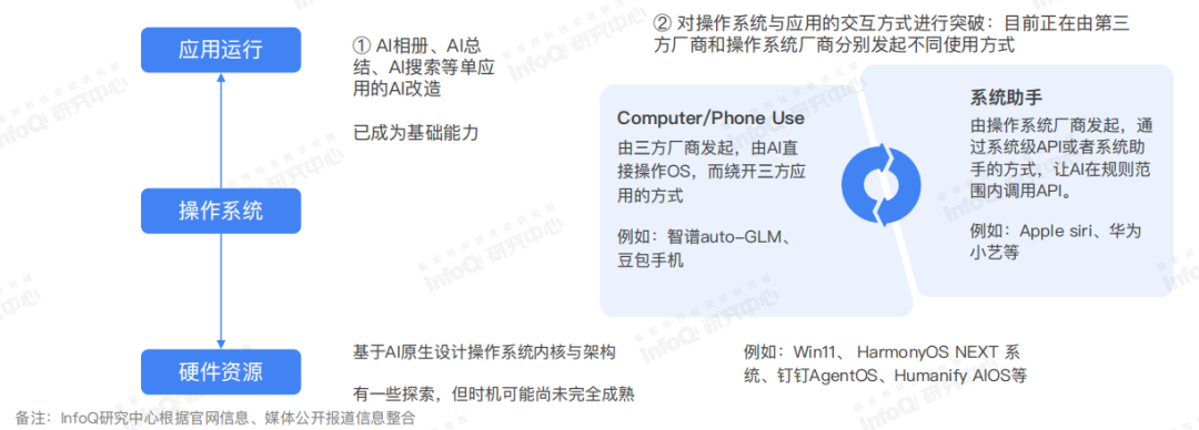 InfoQ研究中心在2年前的年度报告中,提及手机和电脑厂商探索将大模型能力搭载在端侧。彼时的探索更多在总结摘要和图像处理上,可视为AI向终端渗透的初步尝试。两年过去,这种针对单应用的AI赋能已演进为基础能力。行业焦点正从单点功能的实现,转向对操 作系统底层的深度重构,即AIOS的探索迈出了实质性一步。
