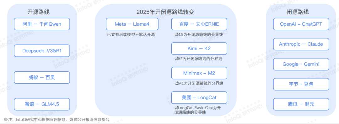 2025年,中国市场中,开源队伍逐渐壮大,除了一直以来坚持开源路线的阿里Qwen 、DeepSeek等,百度、Kimi 、Minimax、美团等均经历了从闭源为主转向开源的过程。