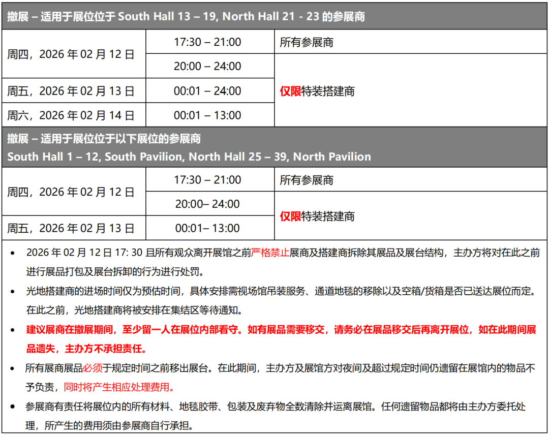 展览期间(每日 18:00 之前)以及展览最后一天(17:30 之前),参展商不得提前退场或拆卸/打包展品。违者将被处以罚款,情节严重者将影响下一年展会的申请。