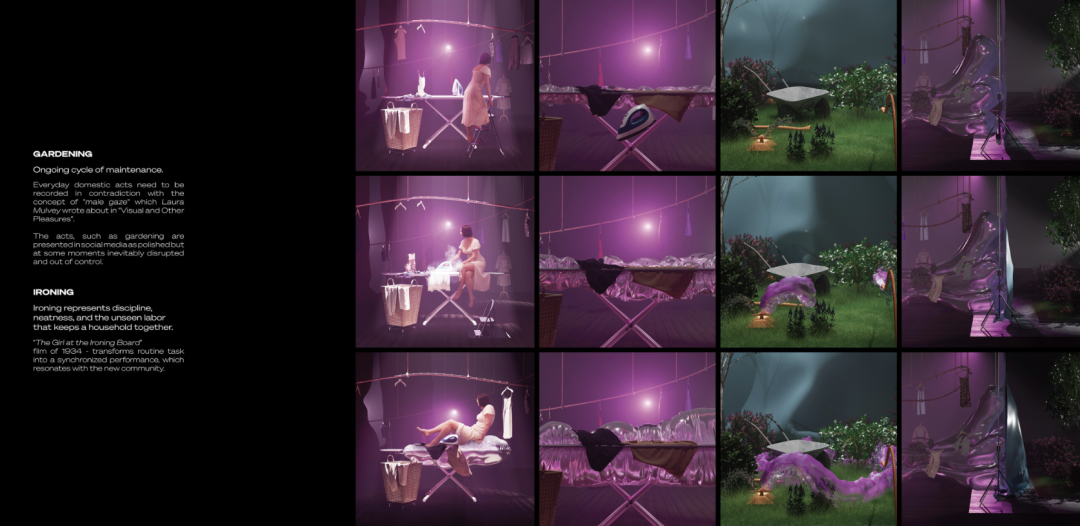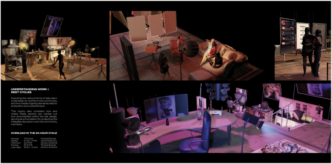 通过画外音和诸如充气干预和直播睡眠之类的视觉隐喻,作品批判了隐私的侵蚀以及对可见性的无休止追求,尤其是对女性而言。作品模糊了家庭生活、抗议和生产的界限,揭示了休息既是奇观,也是布景。